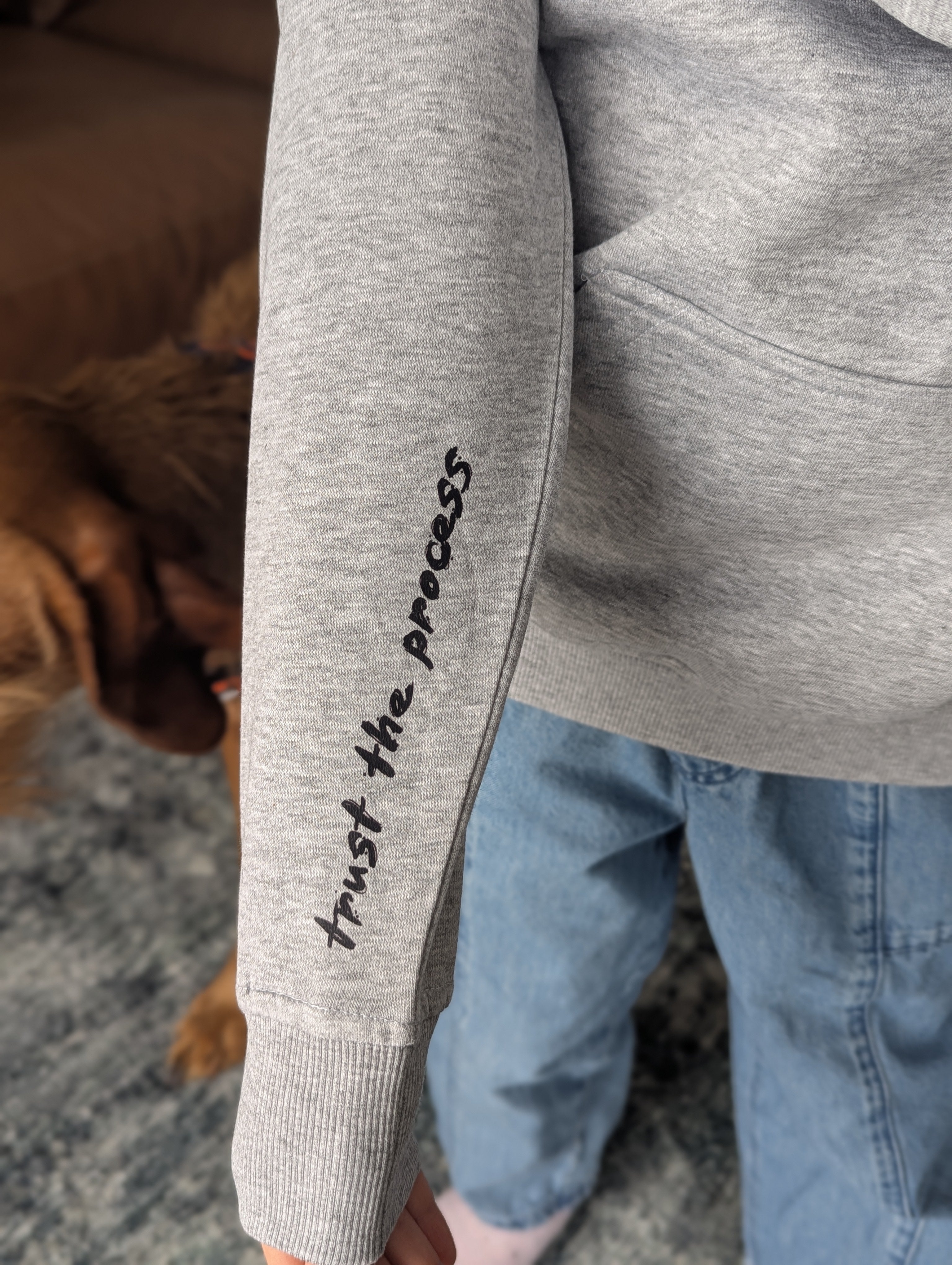 Hand sketched bird on the front (right from my sketchbook). Finished process on the back. 'Trust the Process' mantra on the sleeve. Design secret in the pocket: reminding you: you can do amazing things and this community stands by you.